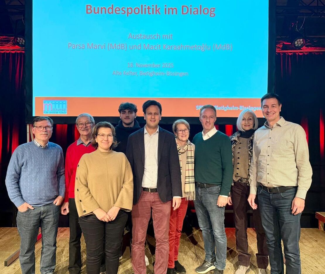 Nachdem bei der Bundestagswahl Anfang des Jahres der Direktkandidat der SPD im Wahlkreis Neckar-Zaber, Mario Sickinger, das Direktmandat knapp verpasst hat, hat der Wahlkreis keinen eigenen SPD-Abgeordneten im Bundestag. Die Interessen des Wahlkreises für uns vertritt darum der Karlsruher MdB Parsa Marvi. Dieser kam zusammen mit dem Ludwigsburg MdB Macit Karaahmetoglu am Dienstag den 18. November in Bietigheim zu einem ersten Kennenlerntreffen mit den SPD-Mitgliedern des Wahlkreises. Im Fokus stand die Bundespolitik und die Erwartungen der Mitglieder an die schwarz-rote Koalition. Beide Abgeordneten machten deutlich, dass das Regieren mit einer teils noch regierungsunerfahrenen Unionsfraktion nicht immer einfach sei, die SPD jedoch alles dafür tue, dass die Regierung erfolgreich arbeiten könne. Zentrale Werte der Sozialdemokratie müssten dabei respektiert werden, etwa die Lebensleistung der arbeitenden Bevölkerung. Vom SPD Ortsverein Sachsenheim waren wir zu siebt dabei und freuen uns auf die Zusammenarbeit mit dem erfahrenen Abgeordneten Parsa Marvi.