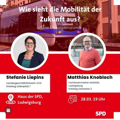 In der Mobilität stehen in den kommenden Jahren in Stadt und Landkreis Ludwigsburg große Umbrüche und Herausforderungen an. Die SPD lädt ein zur Diskussionveranstaltung ‚Mobilität der Zukunft‘ mit den Spitzenkandidierenden im Kreistag Stefanie Liepins, stellv. Fraktionsvorsitzende, und Matthias Knobloch, Fachbereichsleiter für Mobilität der Stadt Ludwigsburg.