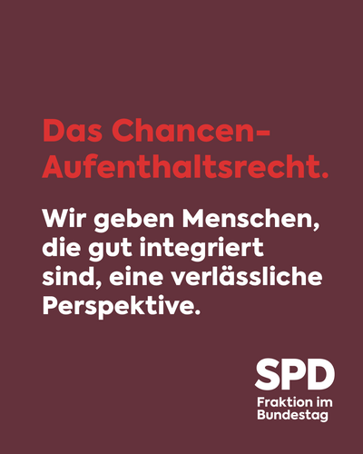 Damit machen wir Schluss mit Kettenduldungen und beenden die unsichere Lage der Menschen, die sich bisher teilweise von Monat zu Monat hangeln mussten. Mit dem Chancen-Aufenthaltsrecht geben wir ihnen eine echte Perspektive in Deutschland und leiten den Neuanfang in der Migrationspolitik ein.
