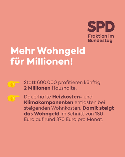 ---> Wir entlasten mit einer dauerhaften Heizkostenkomponente und einer Klimakomponente bei steigenden Wohnkosten. Die Heizkostenkomponente hilft langfristig gegen die hohen Energiepreise, die Klimakomponente federt zusätzliche Kosten aufgrund von Klimaschutzmaßnahmen im Bestand und Neubau ab. So erhöhen wir das Wohngeld im Schnitt von rund 180 Euro auf rund 370 Euro pro Monat. Das entspricht einer Steigerung von 106 Prozent!